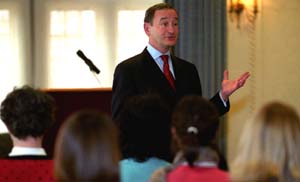 Chancellor Mark S. Wrighton addresses the audience at a “Chat With the Chancellor” Feb. 17 in the Women’s Building Formal Lounge. Wrighton spoke on several issues of importance to all members of the University community, and he also took questions from the audience. Another “chat” will be from 12:10-12:50 p.m. March 19 in the West Campus Multipurpose Room. The chats are offered by the Office of Human Resources as part of the Brown Bag Seminar series.