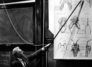 Viktor Hamburger, Ph.D., a founding father in the field of developmental neurobiology, lectures to a zoology class in 1960. Hamburger joined the zoology department in 1935 and chaired it from 1941-1966 before gaining emeritus status in 1968. Hamburger (1900-2001) was one of at least 15 intellectuals who migrated from Europe to Washington University between the end of World War I to shortly after World War II. Some were fleeing political oppression, others were escaping religious persecution — Hamburger was a native of Germany with Jewish ancestry. Nobel Prize-winners Carl and Gerty Cori were the first. Others included Egon Schwarz, professor emeritus of German and the Rosa May Distinguished Professor Emeritus in the Humanities, who was a native of Vienna but forced to flee Europe in the 1940s and taught at the University for 32 years; and Gustav Shonfeld, the Samuel E. Schechter Professor of Medicine and a lipid expert, who survived Auschwitz and moved to St. Louis in 1946, joined the University faculty in 1972 and later chaired the Department of Internal Medicine.