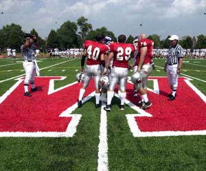 Washington U. captains (from left) John Woock, Rick Schmitz and Robert Cornejo shake hands with the Mount Union College captains before the coin toss of their Sept. 4 season opener. The contest marked the debut of Francis Field’s FieldTurf, and the stands were abuzz with remarks about how sharp the new playing surface looked. Unfortunately for the Bears, the top-ranked Purple Raiders rolled to a 38-0 win, their 95th consecutive regular-season victory. More sports news
