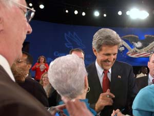 After the intense 90-minute debate, the mood lightened considerably as many of the 140 town-hall participants got autographs and took photographs with Kerry (top) and Bush (above).
