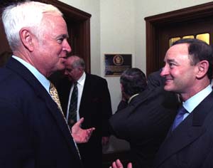 Approximately 20 individuals came to the Hilltop Campus recently as part of the 100th-anniversary celebration of the National Association of Secretaries of State (NASS). Among the visitors were David L. Biddulph (left), an NASS corporate affiliate, speaking with Chancellor Mark S. Wrighton after the unveiling of a plaque (background, above) in Brookings Hall. The marker reads: “The National Association of Secretaries of State, the oldest association of public officials in the United States, was founded on this site 28 September 1904, during the St. Louis World’s Fair. Dedicated in honor of the NASS Centennial Celebration.”