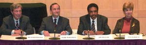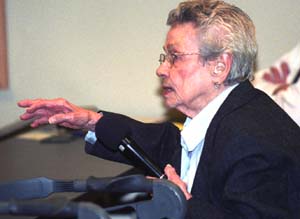 At the Report to Washington University Neighbors meeting Oct. 27, neighbor and 1943 alumna Virginia Boyd (below) asks a question of University panelists (above, from left) Richard A. Roloff, executive vice chancellor; Chancellor Mark S. Wrighton; James E. McLeod, vice chancellor for students and dean of the College of Arts & Sciences; and Patricia Barrett, member of the WUSTL Neighbors Council. The annual meeting, held this year in the auditorium of Uncas A. Whitaker Hall for Biomedical Engineering, gives neighbors an opportunity to hear about developments at the University and a chance to voice comments and concerns. About 75 neighbors attended this year’s forum, despite a Cardinals’ home World Series game that evening.