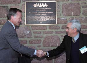 Larry Brase Jr. (left), Region 5 director of the American Institute of Aeronautics and Astronautics (AIAA), and Edward S. Macias, Ph.D., executive vice chancellor, dean of Arts & Sciences and the Barbara and David Thomas Distinguished Professor in Arts & Sciences, celebrate the placement of a commemorative plaque on the south-facing wall of McMillan Hall in a ceremony Nov. 12. The field west of Olin Library extending to the Athletic Complex was the “aeronautic concourse” of the 1904 St. Louis World’s Fair and has been deemed a “significant aerospace site” by the AIAA’s Historic Aerospace Sites Program. Representatives from the two institutions and the Missouri Historical Society celebrated the occasion with a reception at the Rettener Gallery in the Arts & Sciences Laboratory Science Building.