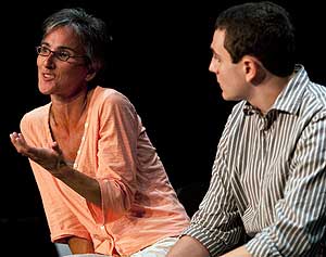 Visiting dramaturg Liz Engelman (left) and sophomore Max Rissman discuss Rissman’s one-act play “Razor Love” Sept. 25 in the A.E. Hotchner Studio Theatre. The “talk-back” session followed a staged reading — directed by Jeffery Matthews, senior lecturer in the Performing Arts Department (PAD) in Arts & Sciences — held as part of the PAD’s 2009 A.E. Hotchner Playwriting Festival. Engelman, a freelance dramaturg from Minneapolis and board chair of Literary Managers and Dramaturgs of the Americas, has helped develop new plays across the country.