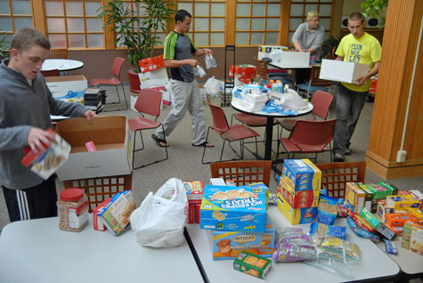 Jill Edwards (back, in gray), project manager for university accreditation programs, and members of the Gateway Battalion Army ROTC pack boxes of donated home-baked goods, snacks, batteries, toiletries and more to send in care packages to U.S. troops serving in Iraq and Afghanistan Oct. 1. That day at Washington University’s North Campus lunchroom, the WUSTL military care package group — which is led by Edwards and organizes the mailings throughout the year — surpassed five tons of goods donated by the WUSTL community and mailed overseas to soldiers since the group formed in March 2004. For more information about the group or to donate, e-mail Edwards at jilledwards@wustl.edu.