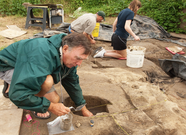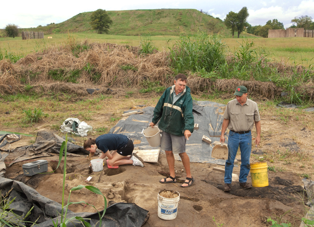 You can hear the clicking of crickets but very little else. Yet just beyond the earthen lip to your right, under what was formerly Mound 34, an instructor and two students work diligently some 4 to 5 feet below the ground’s surface. In a pit, approximately 40 by 40 feet, archaeologist John Kelly, PhD, doctoral candidate Tim Schilling and freshman Grace Niswander quietly wield metal trowels and sift through layers of dirt. Their deliberate movements yield small progress, but their patient hands continue the search. They seek clues to the people that inhabited this space 600 to 1,000 years ago.