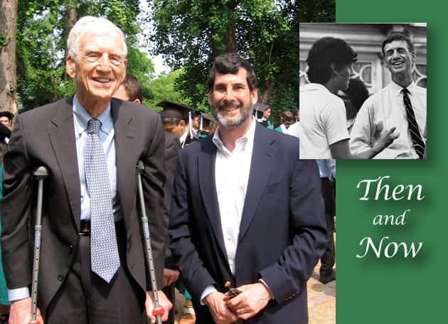 Alumnus Michael Millenson, AB ’75, reconnects with Chancellor Emeritus William H. Danforth during the 2011 Commencement. While a student, Millenson was pictured with then newly appointed Chancellor Danforth in a 1971 issue of Washington Magazine. (Courtesy of Washington University Photographic Services)