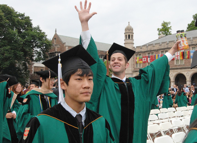 To honor the diverse international heritage of the university’s graduating students, 66 flags (background), representing students’ home countries, were hung on January, Ridgley and Duncker halls. (Courtesy Washington University Photographic Services)