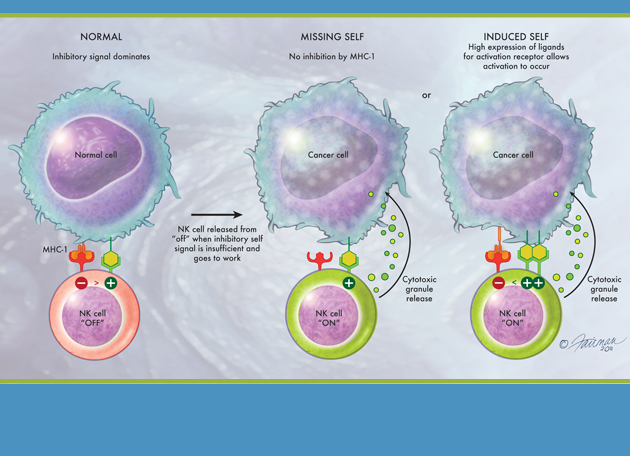 A major leap in thinking then was required to realize that NK cells bind to MHC-1 just as T-cells do, but work in the opposite fashion. “When an NK cell sees an MHC-1 molecule, it doesn’t note that there is a foreign peptide being displayed. Instead, its job is to patrol for self, and when it binds to MHC-1, the NK cell is shut off,” Yokoyama explains. “Only when the self signal is insufficient is the NK cell released from its ‘off’ condition and freed to do its work.” That’s vitally important information, because viruses have evolved to depress MHC-1 in their attempt to evade T-cells. So NK cells serve an important role as a fail-safe in the immune system, effective when another of the body’s defenses has been blinded by tricky infections.