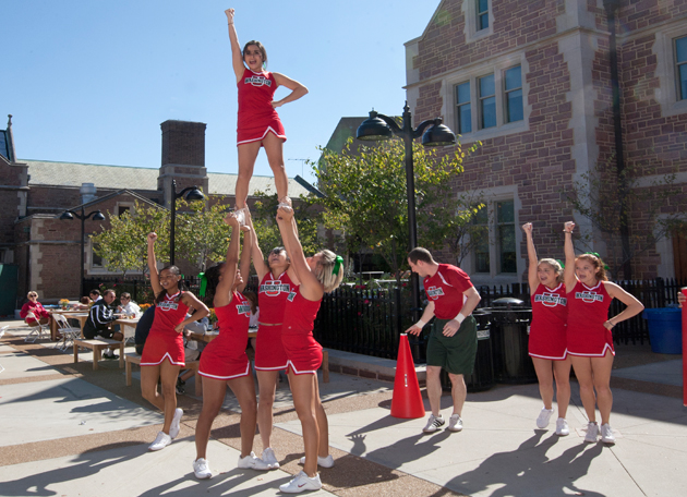 The Washington University cheerleaders got the Fall Festival crowd fired up for the Bears football game against the College of Wooster Fighting Scots. The Bears went on to win the game, 24–20. (Jerry Naunheim Jr.)