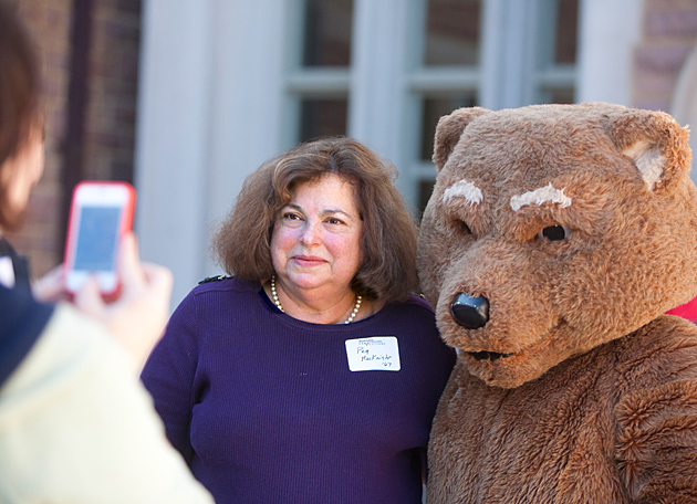 Peggy MacKnight, AB ’67, got to meet the university’s Bear mascot. (Jerry Naunheim Jr.)