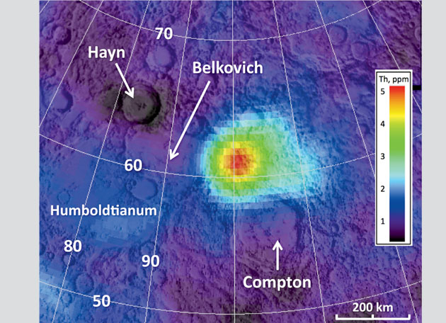 In 1998, the Lunar Prospector Gamma Ray Spectrometer detected an isolated concentration of the radioactive element thorium in the region of the Compton and Belkovich craters on the Moon’s far side. [Compton Crater was named after Arthur Holly Compton (Washington University chancellor, 1945–53, and recipient of the Nobel Prize for Physics in 1927) and his brother, Karl T. Compton.] Similar “hot spots” exist on the Moon’s near side where upwellings of magma rich in silica occurred, but the Compton-Belkovich Thorium Anomaly appears to be uniquely situated. [Incidentally, the anomaly was first discovered in 2000 by David Lawrence, PhD ’96 (physics), who was a member of the Lunar Prospector Gamma Ray Spectrometer team, and who continues to collaborate with Jolliff.]