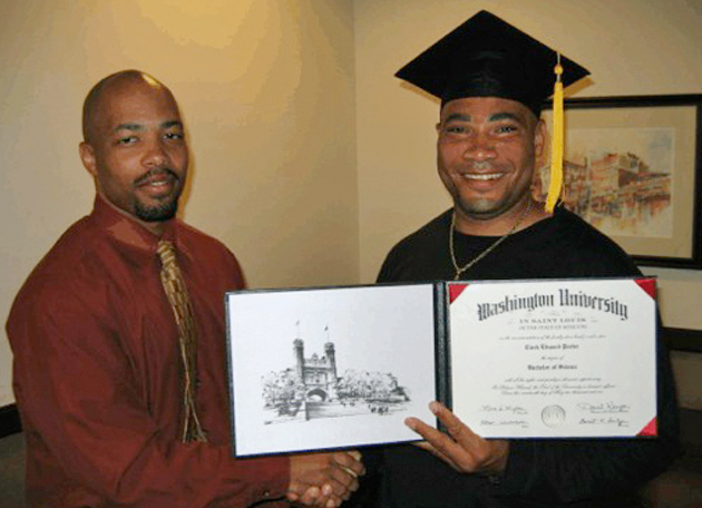He found part-time work as a tutor and research assistant, went on to earn a master’s degree in social work from the University of Missouri–St. Louis, and began looking for a career. He dropped off his résumé with Burris, who was intrigued. With the support of colleagues in the U.S. District Court, Eastern District of Missouri — particularly then Chief Judge Carol Jackson — Burris hired Porter. “I have to admit that originally I thought it was crazy to hire an ex-offender who had robbed a post office that we supervised,” Burris says. “But it turned out to be brilliant.”