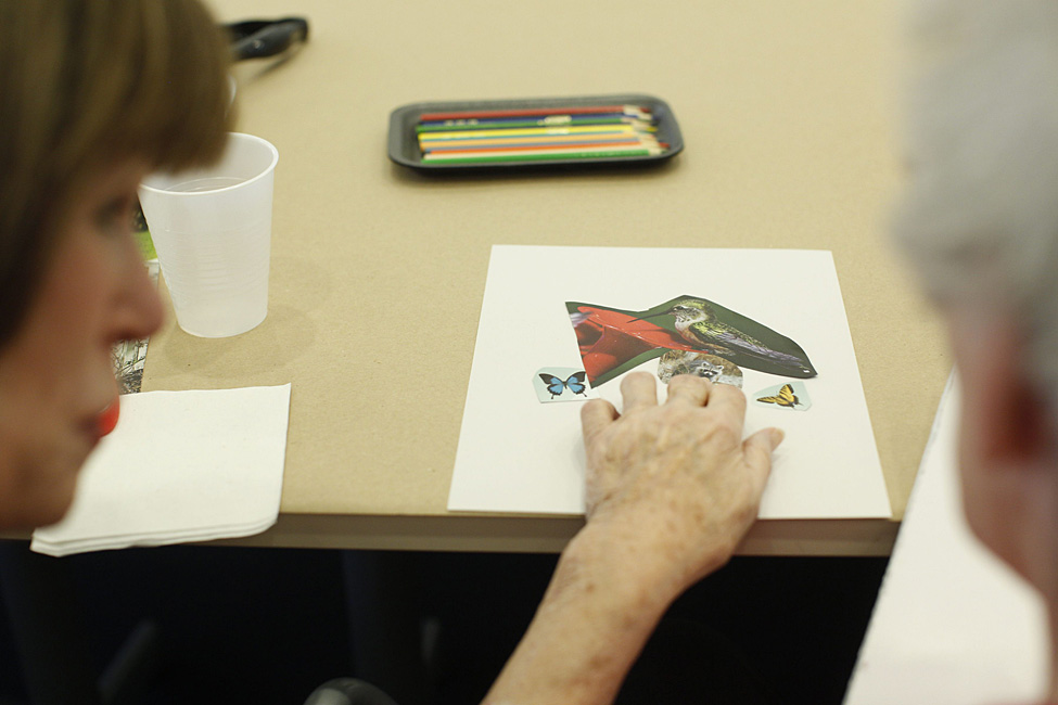 The group breaks and reassembles in a downstairs classroom. Food and art materials — paper, pencils, scissors, magazines — await. Caregivers aid patients in crafting collages of their own.