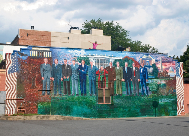Outside Mama Ayesha’s Restaurant in Washington, D.C., Salvadoran-American artist Karla “Karlisima” Rodas (top), BFA ’92, painted a large mural of 11 former presidents, which she calls Keep Driving On. (Courtesy photo)