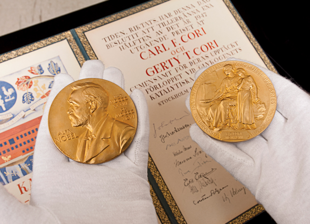 The Bernard Becker Medical Library holds the 1947 Nobel Prize in Physiology or Medicine medals awarded to Carl F. Cori, MD, and Gerty T. Cori, MD, “for their discovery of the course of the catalytic conversion of glycogen.” (Joe Angeles)