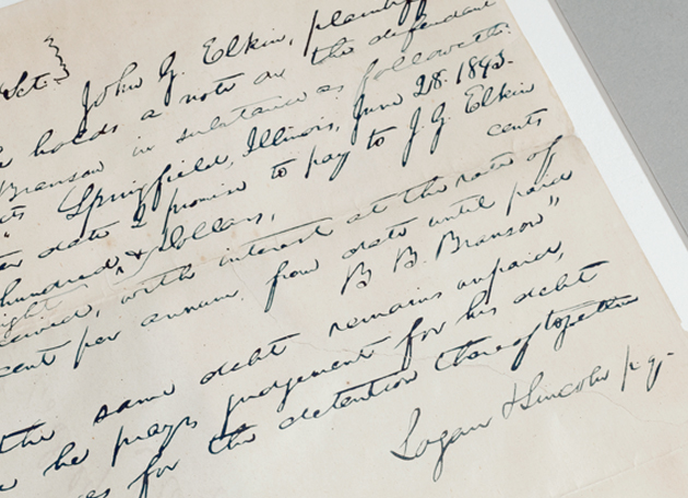 The Law Library holds a court filing submitted by the firm of Logan & Lincoln Esq., in Abraham Lincoln’s hand, dated July 11, 1843. (Joe Angeles)