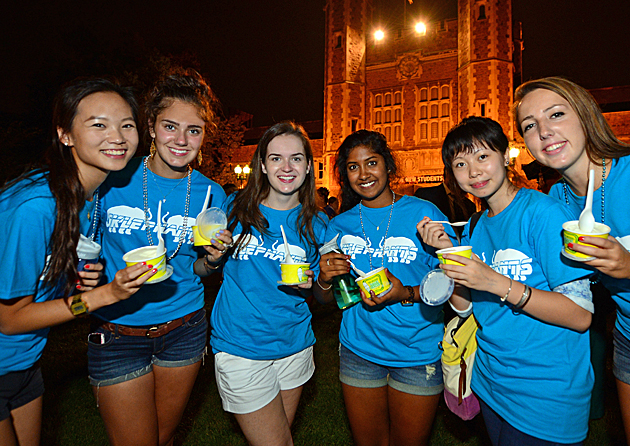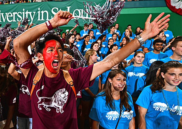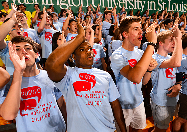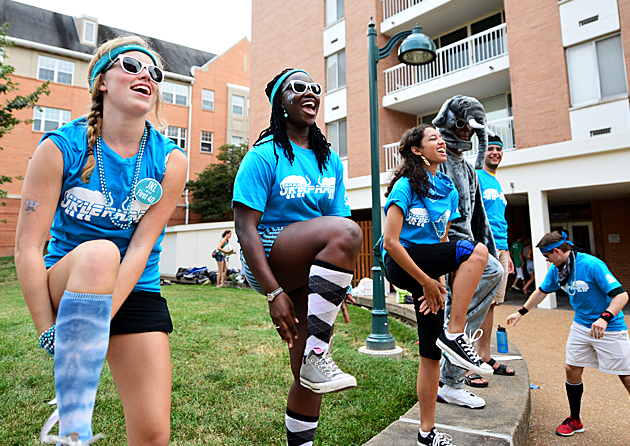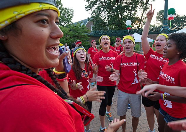 Upperclassmen are an integral part of building excitement and helping new students with their transition to college life. More than 400 Washington University Student Associates (WUSAs), residential advisers, residential life staff, and faculty and student volunteers help students find their way. (Joe Angeles)