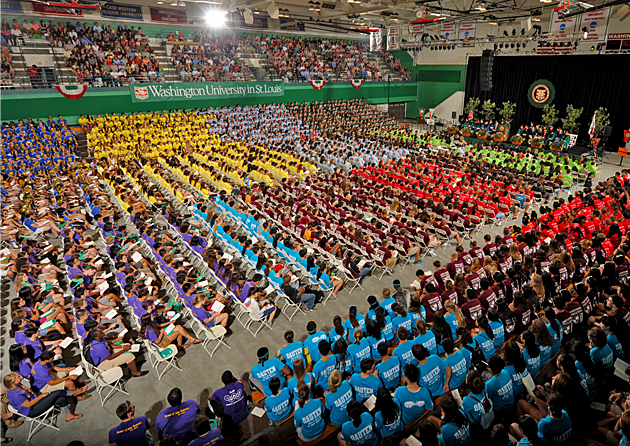 Sitting with their new communities and sporting their college-specific T-shirts, students create a patchwork effect at Convocation. The colleges and colors are as follows: Thomas Eliot/Eliot B: purple and gold; Park/Mudd: red and black; William Greenleaf Eliot: forest green; Shanedling/Dauten/Rutledge: turquoise and silver; Wayman Crow: red and white; Lee/Beaumont: yellow and black; Rubelmann/Umrath/South Forty House: light blue and red; Liggett/Koenig: maroon and silver; Hitzeman/Hurd/Myers: orange and brown; Brookings (Lien/Gregg): royal blue and gold. (James Byard)