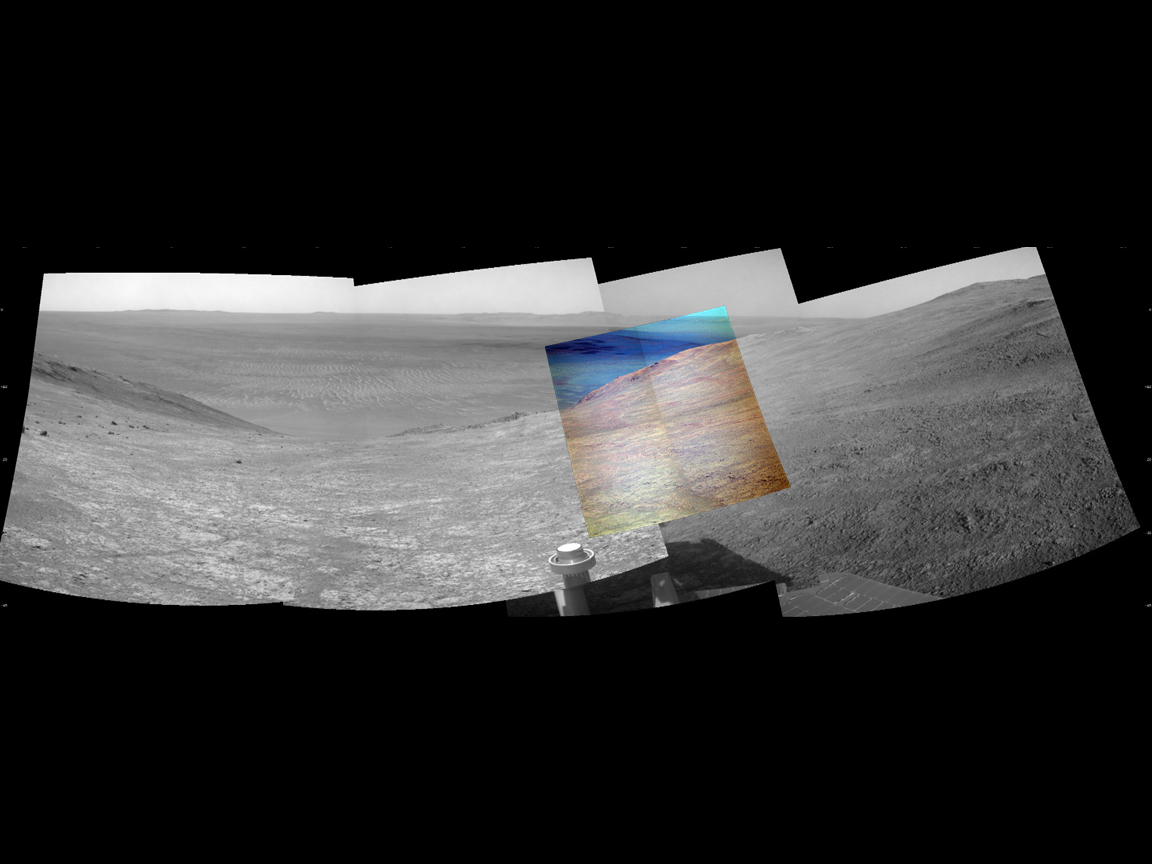 EPS Student Award.Marathon Valley on Mars seen as the Opportunity rover sees it, as separate camera images are stitched together and color from a different camera is overlaid on black-and-white frames.–Valerie Fox