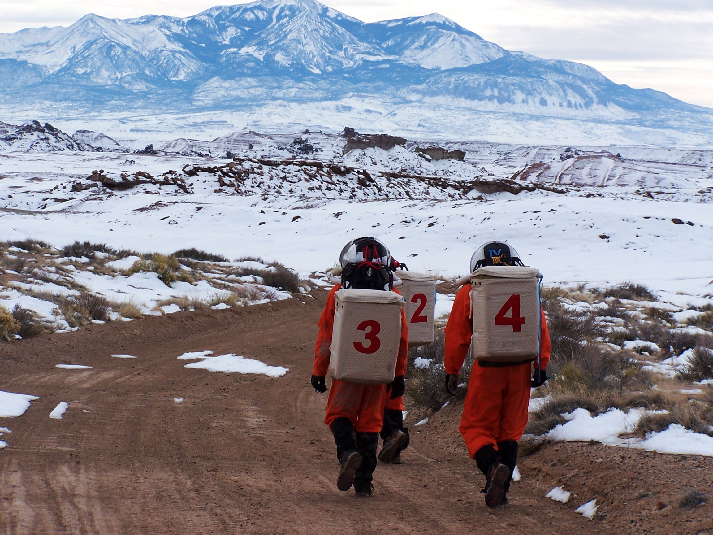 Crew 132 of the Mars Desert Research Station, a field station in Utah that serves as a Mars analog, returning from an EVA (extravehicular activity).–Michael Bouchard
