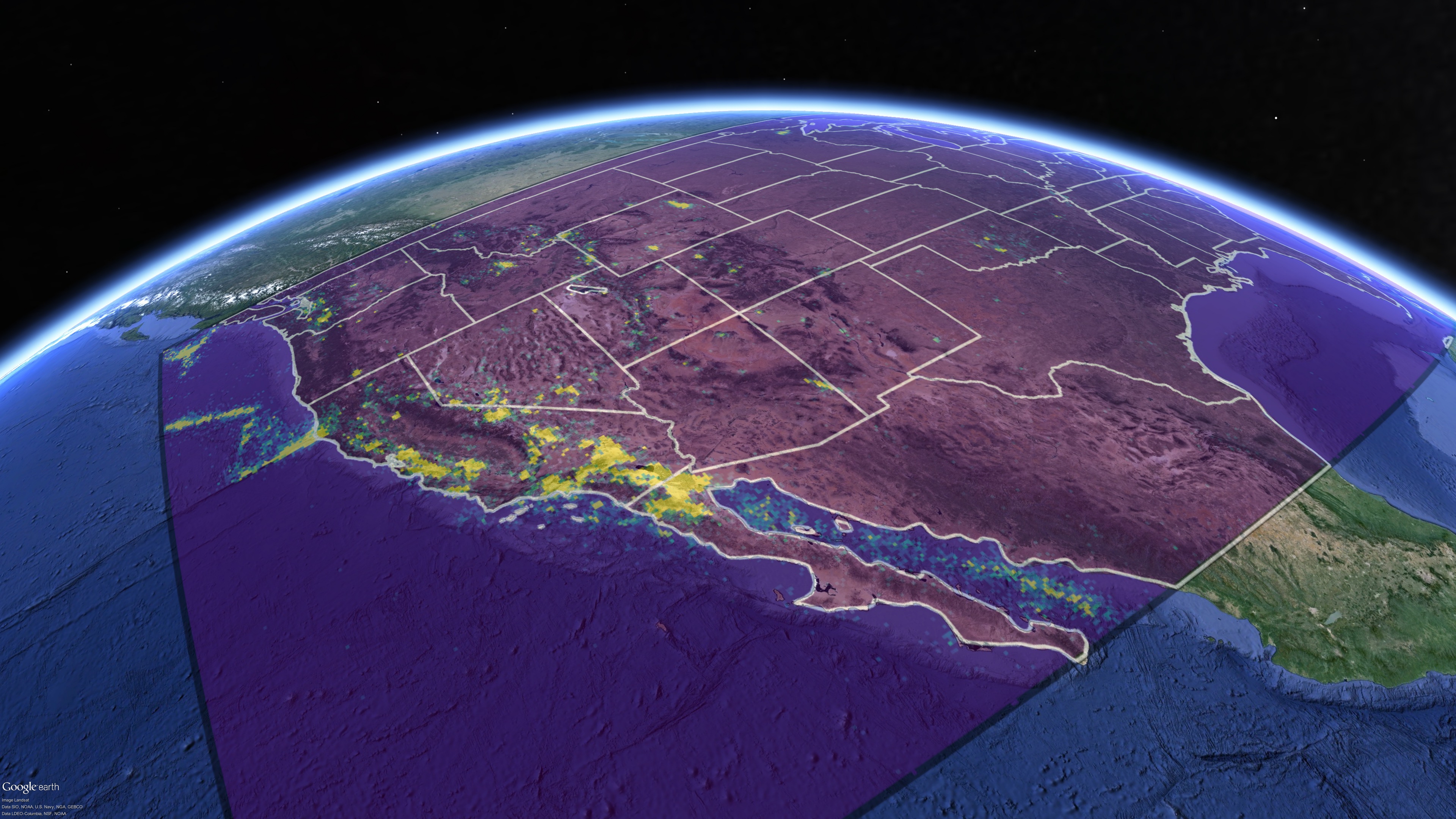 Map of seismic energy released between 1970 and 2010. Recognizable hot spots include: the Nevada nuclear test site; the Northridge earthquake of 1994; the eruption of Mt. St. Helens in 1980; seismicity in Oklahoma induced by fracking and waste-water injection; and a tectonic triple junction.–Martin Pratt