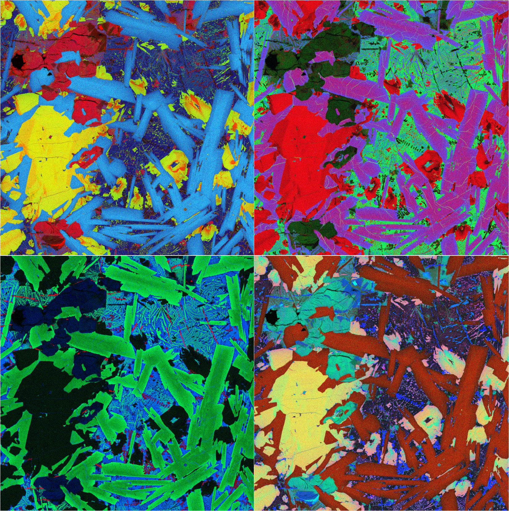EPS Staff/Faculty Award. Images of a Columbia River basalt colored to pick out the main minerals, quench structure and other features. Part of a bench-scale experiment to see what would happen if carbon dioxide were injected into fractured basalt to slow climate change.–Rachel Wells