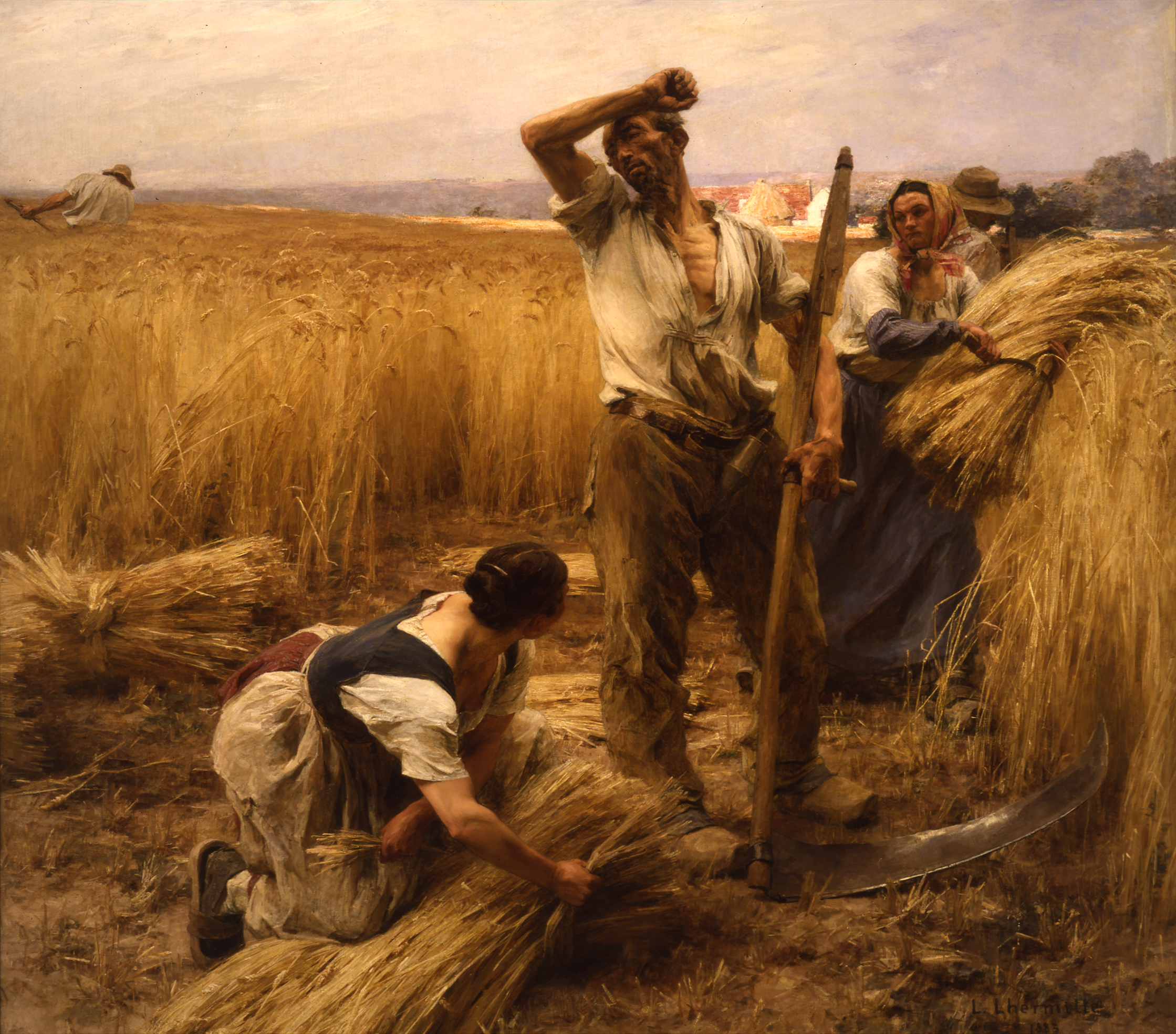 Leading American Realist painter Thomas Eakins’ “Portrait of Professor W. D. Marks” (1886) captures both the likeness and equipment of a prominent electrical engineer in meticulous detail, aided by the technology of photography. In France, the figure of the peasant was a particularly popular subject for Realist artists, whether used in anecdotal contexts such as Jules Breton’s tavern scene (1858), or in works that sought to capture the realities of agrarian labor in detail, as in Léon Lhermitte’s harvesting scene (1883).