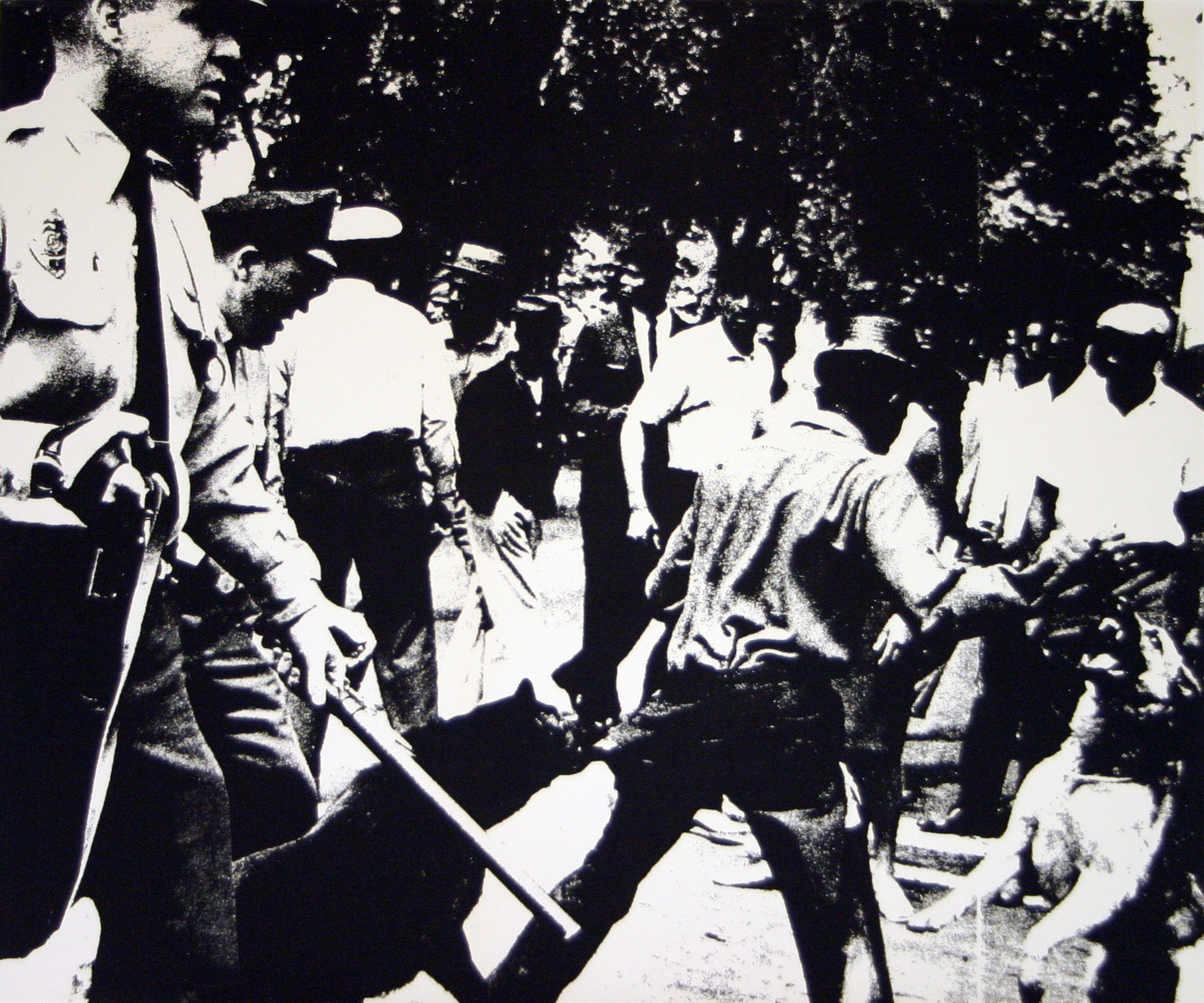 In addition, four works in the museum’s May Department Stores Foyer cross the timeframe of the overall installation, each reflecting distinct points of intersection between art and politics, including American slavery, World War II, the Vietnam war, and 9/11 and its aftermath (respectively): Thomas Ball’s “Freedom’s Memorial” (1875), Alexander Calder’s “Bayonets Menacing a Flower” (1945), Robert Rauschenberg’s “Choke” (1964) and Alfredo Jaar’s “May 1, 2011” (2011).