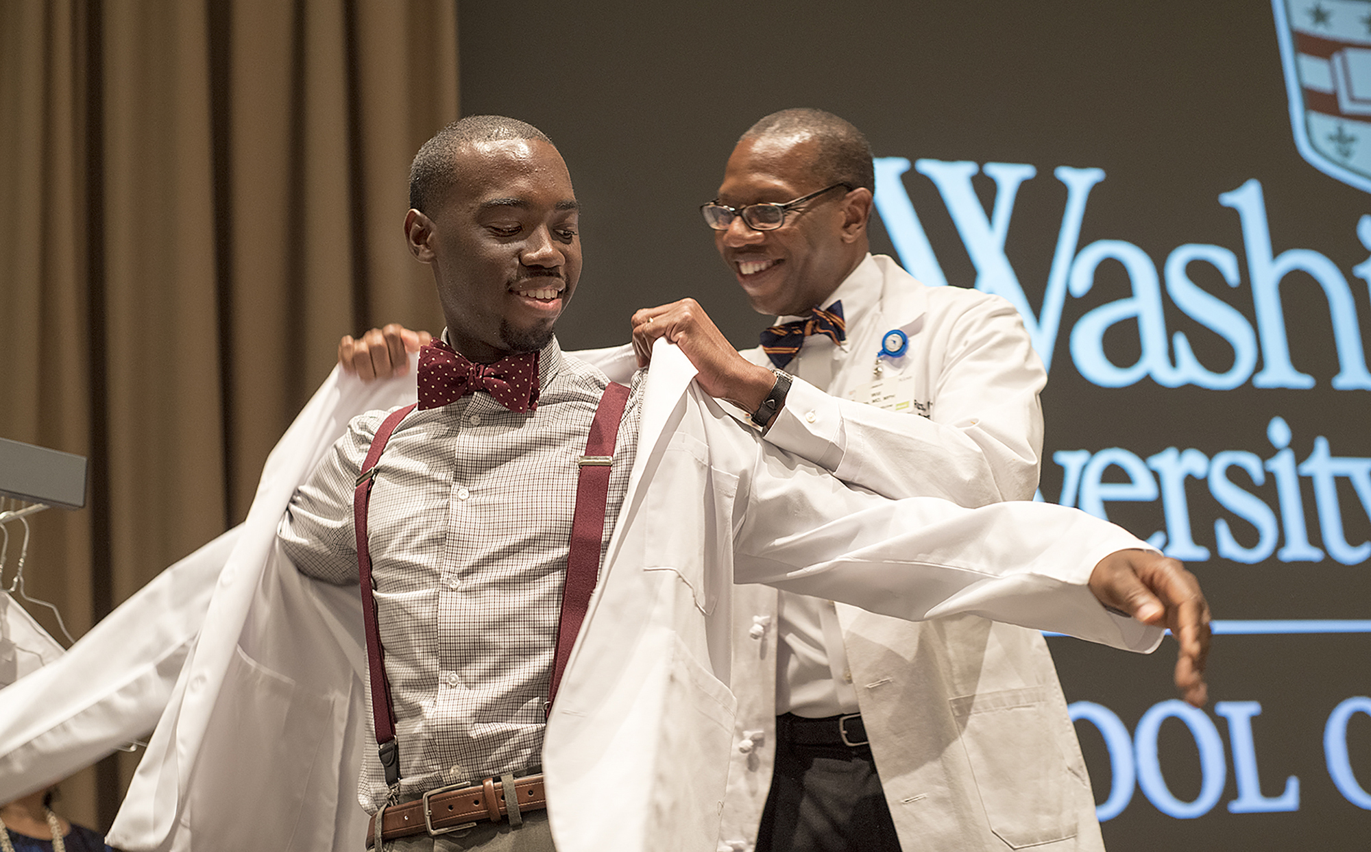 First-year medical student Amal Taylor receives his white coat Aug. 12, 2016, from Will R. Ross, MD, associate dean for diversity at the School of Medicine. The White Coat ceremony is a rite of passage in which future doctors are welcomed to the medical school and the medical profession. (Photo: Robert J. Boston/School of Medicine)