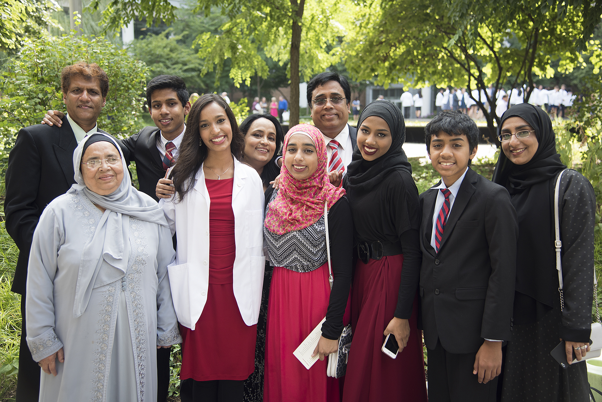 First-year medical student Shahroz Fatima (fourth from left) is surrounded by her family, Aug. 12, 2016, in the Ellen S. Clark Hope Plaza after the School of Medicine White Coat ceremony. The ceremony is a rite of passage in which future doctors are welcomed to the medical school and the medical profession. (Photo: Robert J. Boston/School of Medicine)