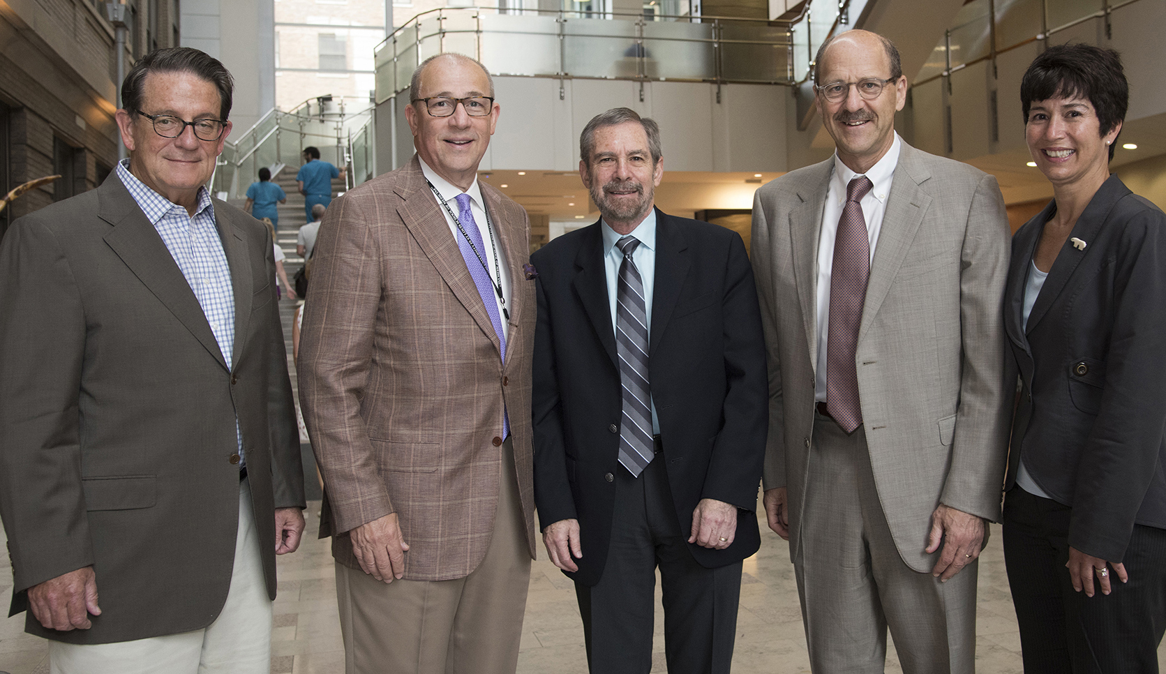 Douglas R. Lowy, MD, acting director of the National Cancer Institute (third from left), met Aug. 5, 2016, with (from left) John DiPersio, MD, PhD, the Virginia E. and Sam J. Golman Professor of Medicine and deputy director of Siteman Cancer Center; Timothy J. Eberlein, MD, the Bixby Professor of Surgery and Siteman’s director; David H. Perlmutter, MD, executive vice chancellor for medical affairs and dean of the School of Medicine; and Karen Kharasch, Siteman’s executive director of research and business administration. (Photo: Robert Boston/School of Medicine)