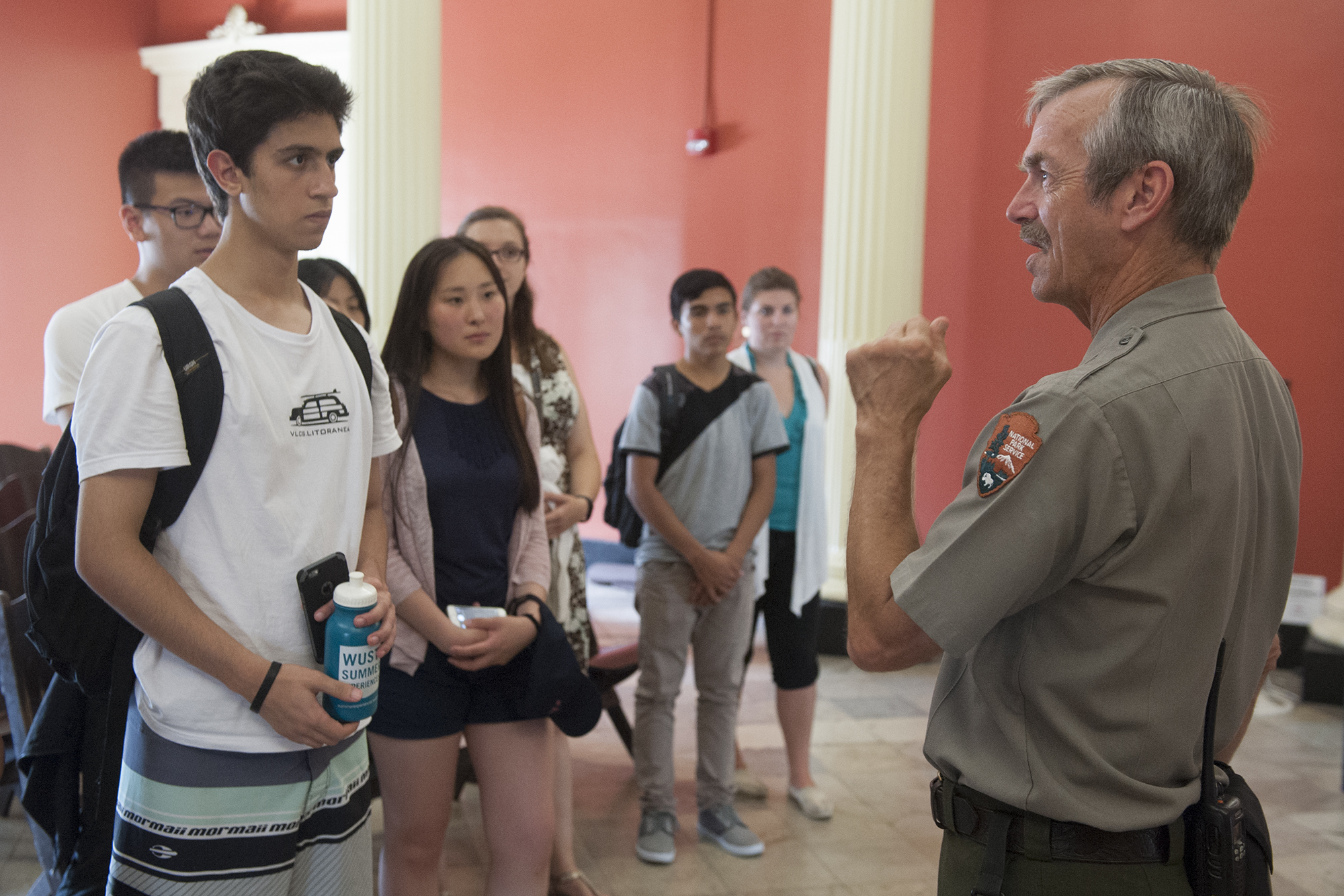 International students taking part in the EducationUSA program at Washington University toured the Jefferson National Expansion Memorial, including the Old Courthouse and the Gateway Arch, as part of their experiences in St. Louis July 22, 2016. National Park Service employee Donald Schwerifeger leads of tour of a courtroom at the Old Courthouse. (Photo: Sid Hastings/Washington University)