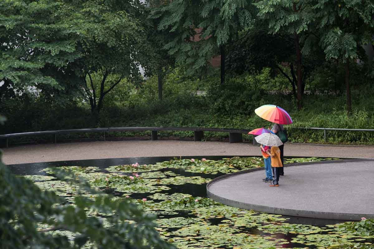 Visitors to the Medical Campus brave the rain on a recent day while stopping by the Ellen S. Clark Hope Plaza.