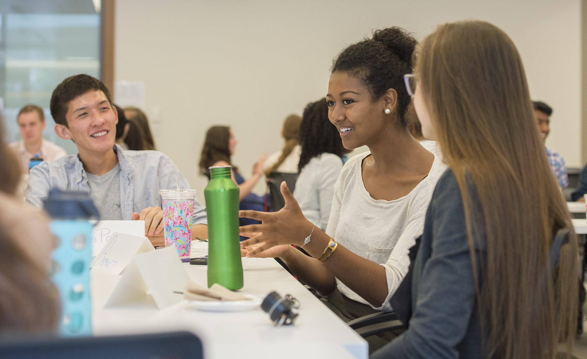 Students share their experiences with others at a breakfast meeting of Washington University’s Summer Associates Program July 29, 2016, in Bauer Hall. Bemnet Tesfaye (center), an incoming sophomore majoring in international affairs, worked as an intern in the Office of Undergraduate Admissions. (Photo: Joe Angeles/Washington University)