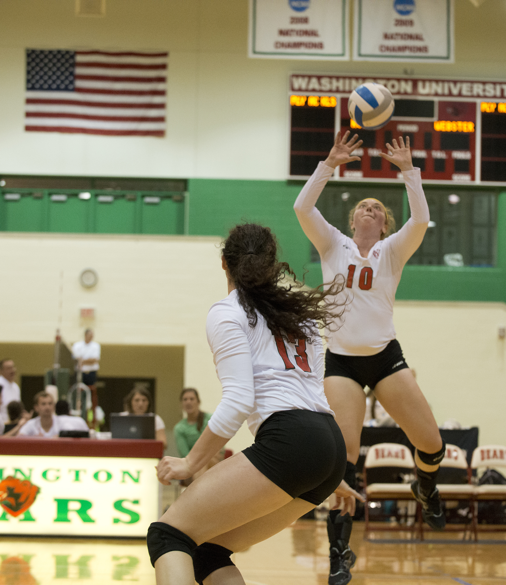 Recent graduate Allison Zastrow (right, during a volleyball game in September 2015) is one of two athletes selected as the University Athletic Association honorees for the 2016 NCAA Woman of the Year Award. The winner will be announced in October. Read more on Bear Sports site. (Photo: Danny Reise/Washington University)