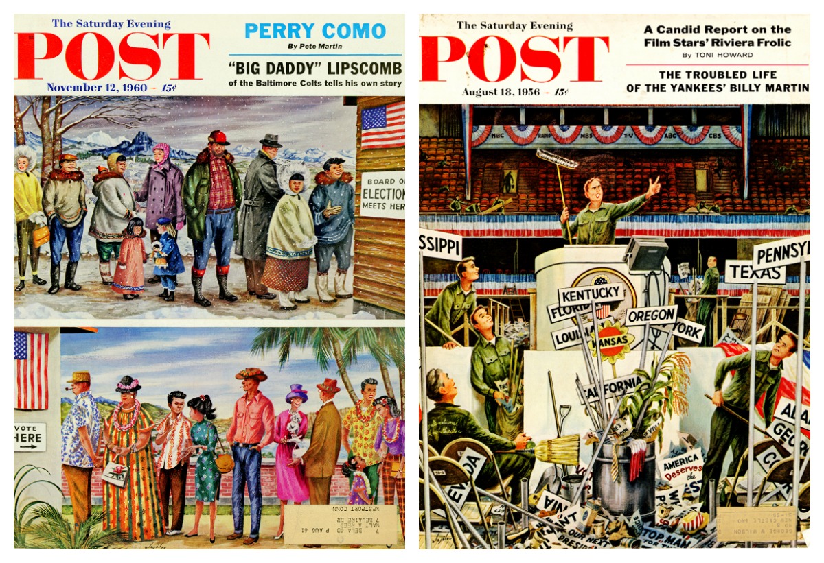 Created by Russian-born illustrator Constantin Alajálov, these Saturday Evening Post covers from 1956 (left) and 1960 celebrate the electoral process. “The publishers of the Saturday Evening Post were main street Republicans, but the Post did not endorse candidates. In line with the magazine’s stress on Americana, elections were presented as civic religion,” Dowd said.