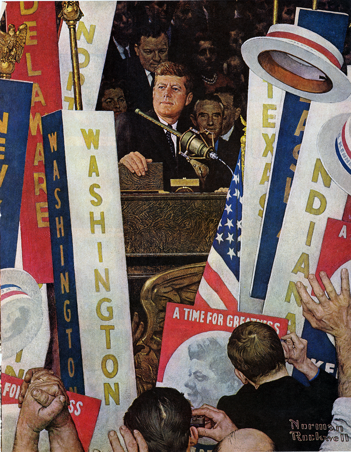 This illustration by beloved American Illustrator Norman Rockwell appeared in Look magazine in 1964, the year after Kennedy was assassinated. During his long career, Rockwell also created portraits of presidents Dwight Eisenhower, Lyndon Johnson, Richard Nixon and Ronald Reagan.