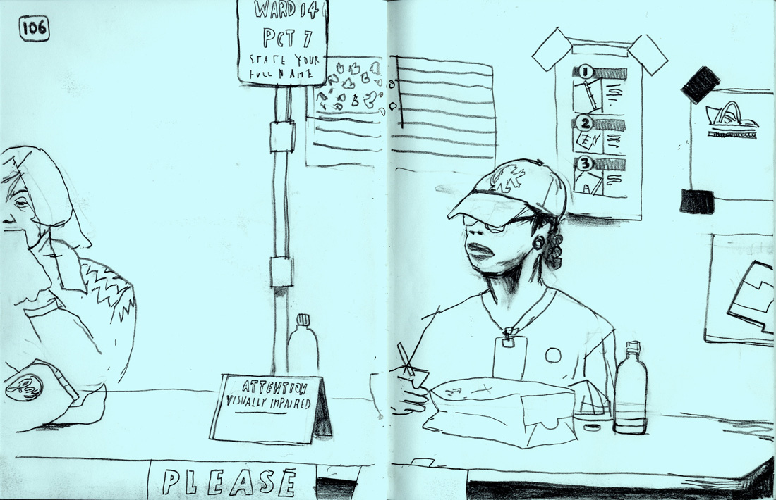 Dowd drew this illustration of poll workers for his 2008 Election Day sketchbook, which was published by the St. Louis Beacon. “When I do on-site work, I try to transform what I am seeing into a visual idea that can be digested pretty quickly,” said Dowd, whose students will capture debate-related activities across campus. “When you’re drawing quickly, what you choose to leave out is as critical as what you put in. Often you have to decide between the two before you even start.”