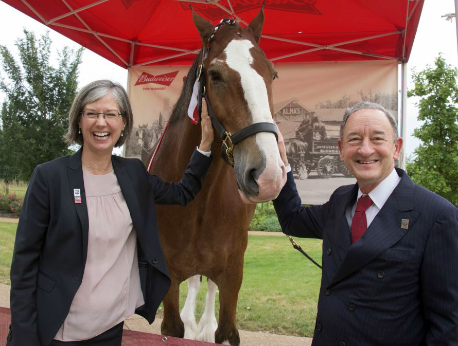 Nancy Staudt, dean of the School of Law, and Chancellor Mark S. Wrighton pose with McGee, a world-famous Budweiser Clydesdale, who was on hand to help celebrate the law school’s 150th birthday Aug. 31, 2016. For more on the event, including a photo gallery. Visit the law school website. (Photo: Mary Butkus)