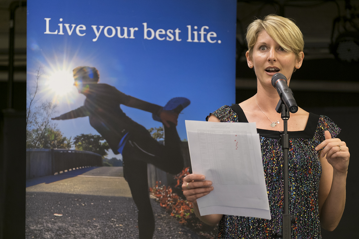 Wellness manager Emily Page speaks to faculty and staff gathered in the Gargoyle for the Danforth Campus launch of the fall 2016 WashU Moves challenge, a contest and and program designed to encourage walking and movement, Sept. 7, 2016. (Photo: Sid Hastings/Washington University)