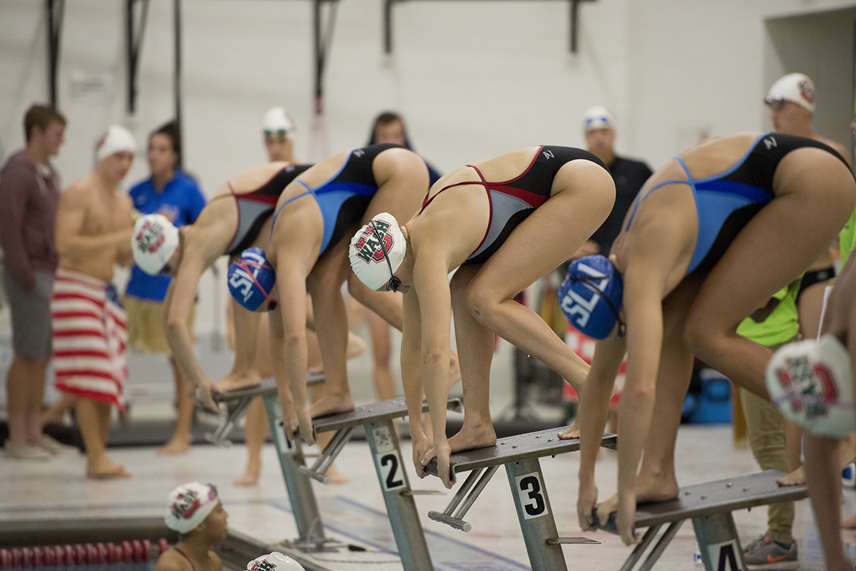 Washington University swimming and diving programs began their 2016-17 seasons Sept. 30 at Millstone Pool. The women and men combined for 15 first-place finishes against Saint Louis University during the university’s Pink Out to kick off Breast Cancer Awareness Month. (Photo: Danny Reise/Washington University)