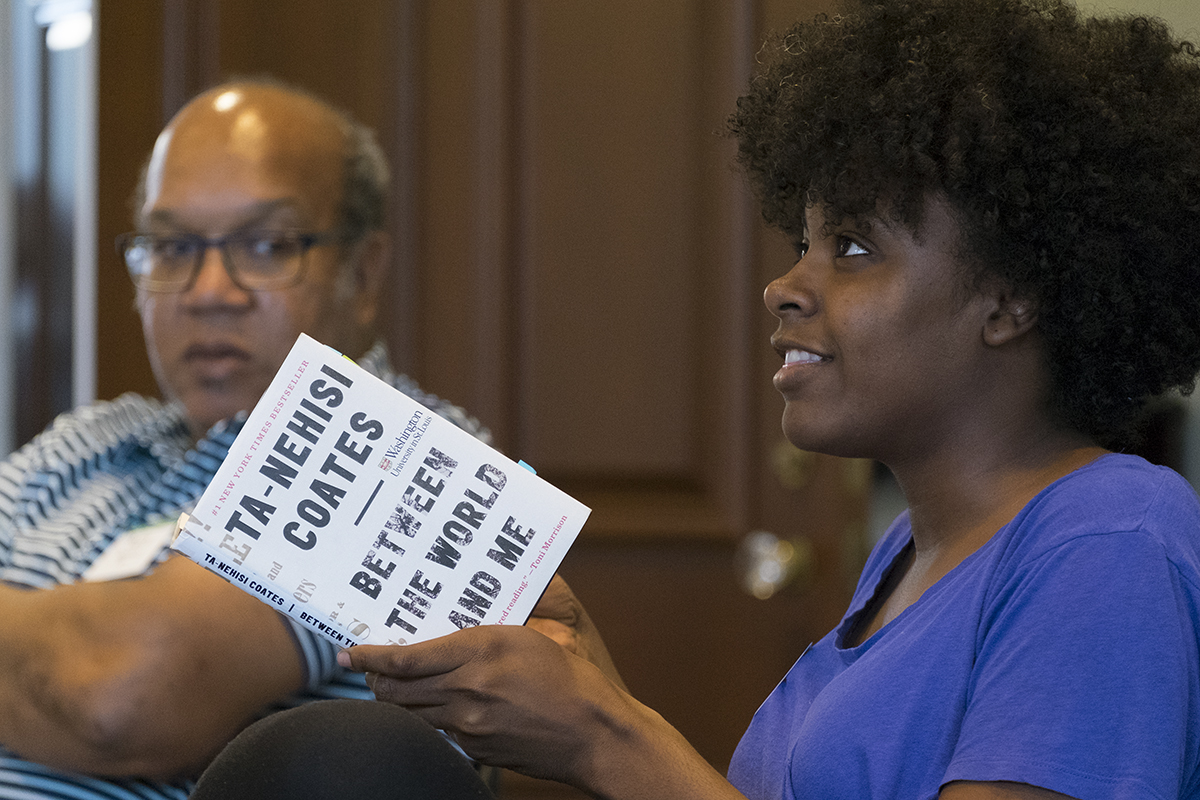 St. Louis-area alumni of Washington University gathered at Alumni House Sept. 26, 2016, for a book discussion of “Between the World and Me” by Ta-Nehisi Coates. Alum Dalayna Jackson participates in the discussion as fellow alum Barry Howard listens. (Photo: Sid Hastings/Washington University)