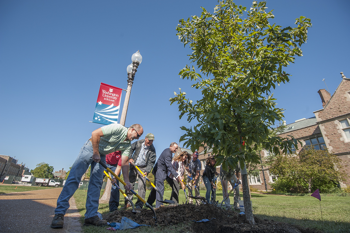 Chancellor Mark S. Wrighton (center, in suit) helps plant the first Chinkapin Oak tree along Oak Allee, the road that connects Brookings Quadrangle to Graham Chapel. Visit the Source to learn more about the tree project. (Photo: Joe Angeles/Washington University)