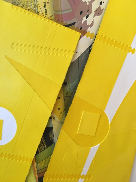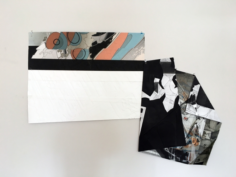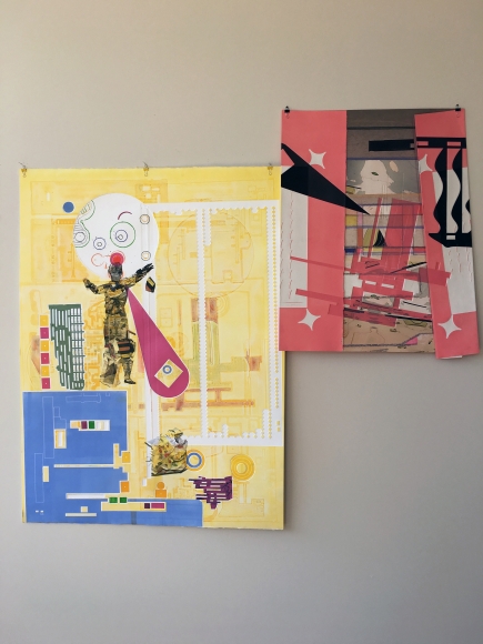 Carmon Colangelo, “Recycler and Pink Slip,” 2016. Print assemblage: monotype, digital and relief print, 54″ x 70″. (Courtesy of the artist)