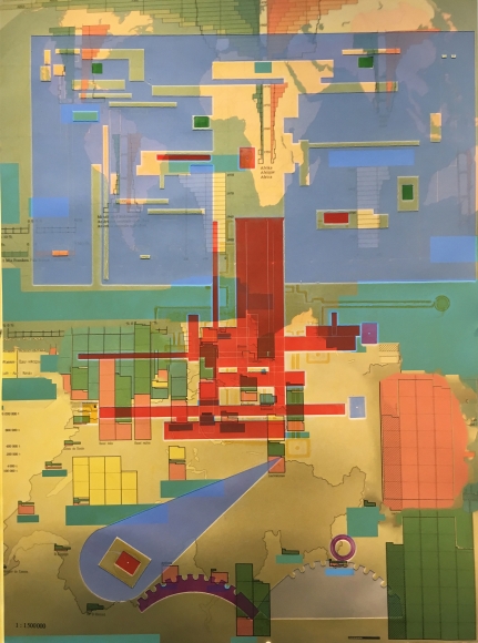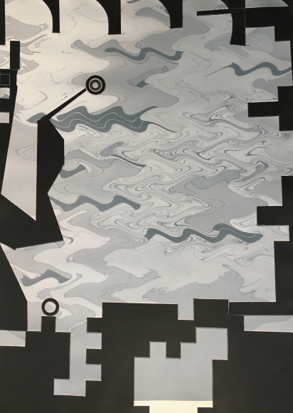 Carmon Colangelo, detail, “Uncharted Waters,” 2016. Print assemblage: monotype, digital and relief print, 42″ x 68″. (Courtesy of the artist)