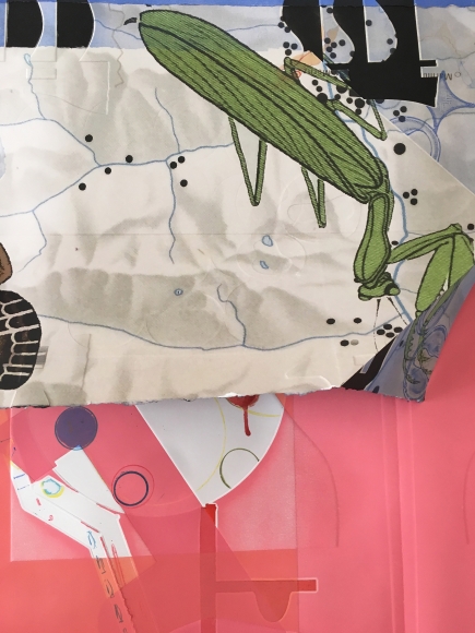 Carmon Colangelo, detail, “Praying Mantis,” 2016. Print assemblage: monotype, digital and relief print, 64″ x 31″. (Courtesy of the artist)