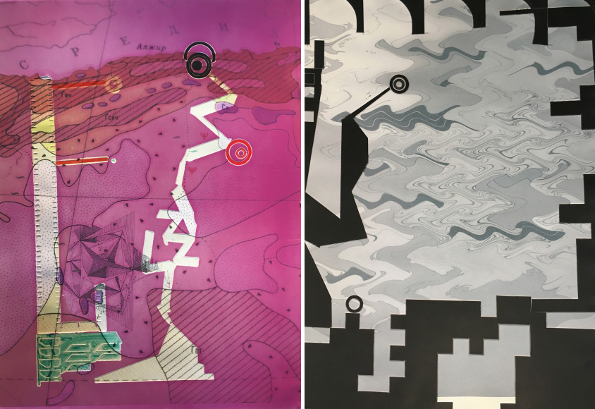 Printed at Flying Horse Editions in Orlando, these large-scale monotypes combine hand-drawing and digital manipulation with a range of materials and techniques designed to highlight the role of chance in shaping our own psycho-geographies. Drafting tools, leftover scraps from laser-cut architectural models and other found materials are recycled and reimagined as part of Colangelo’s personal taxonomy of images. The results are at once seductively tactile and spatially disorienting — and a fitting metaphor for the dangerous waters that, even in a time of increasing global connectivity, must surely lie ahead.