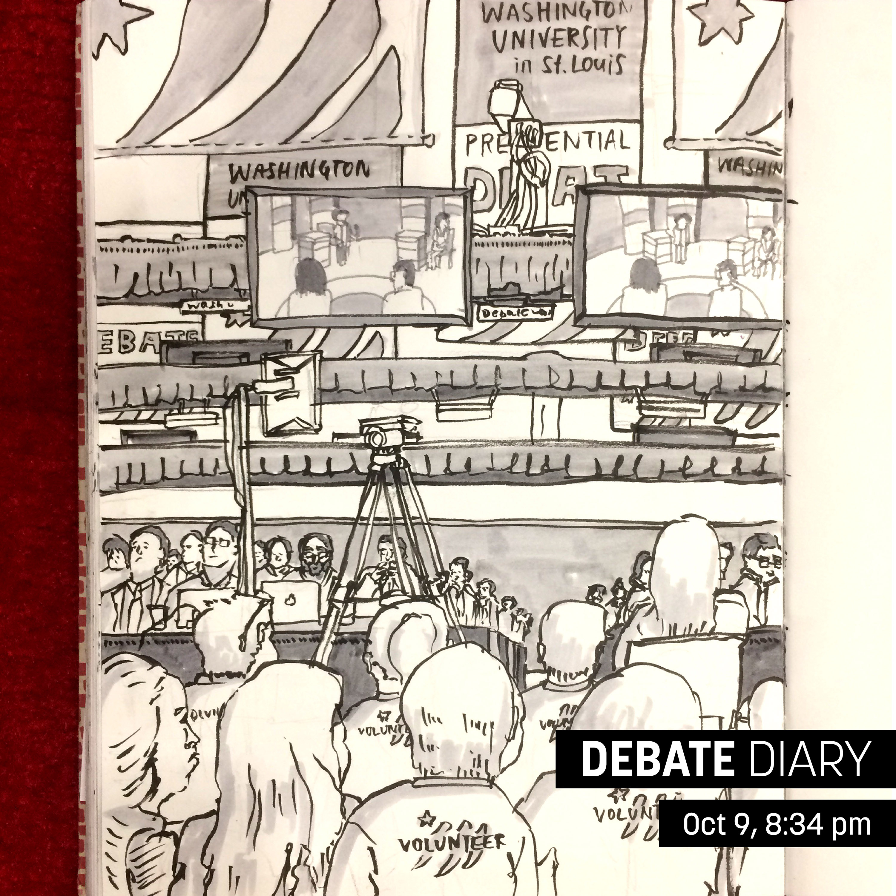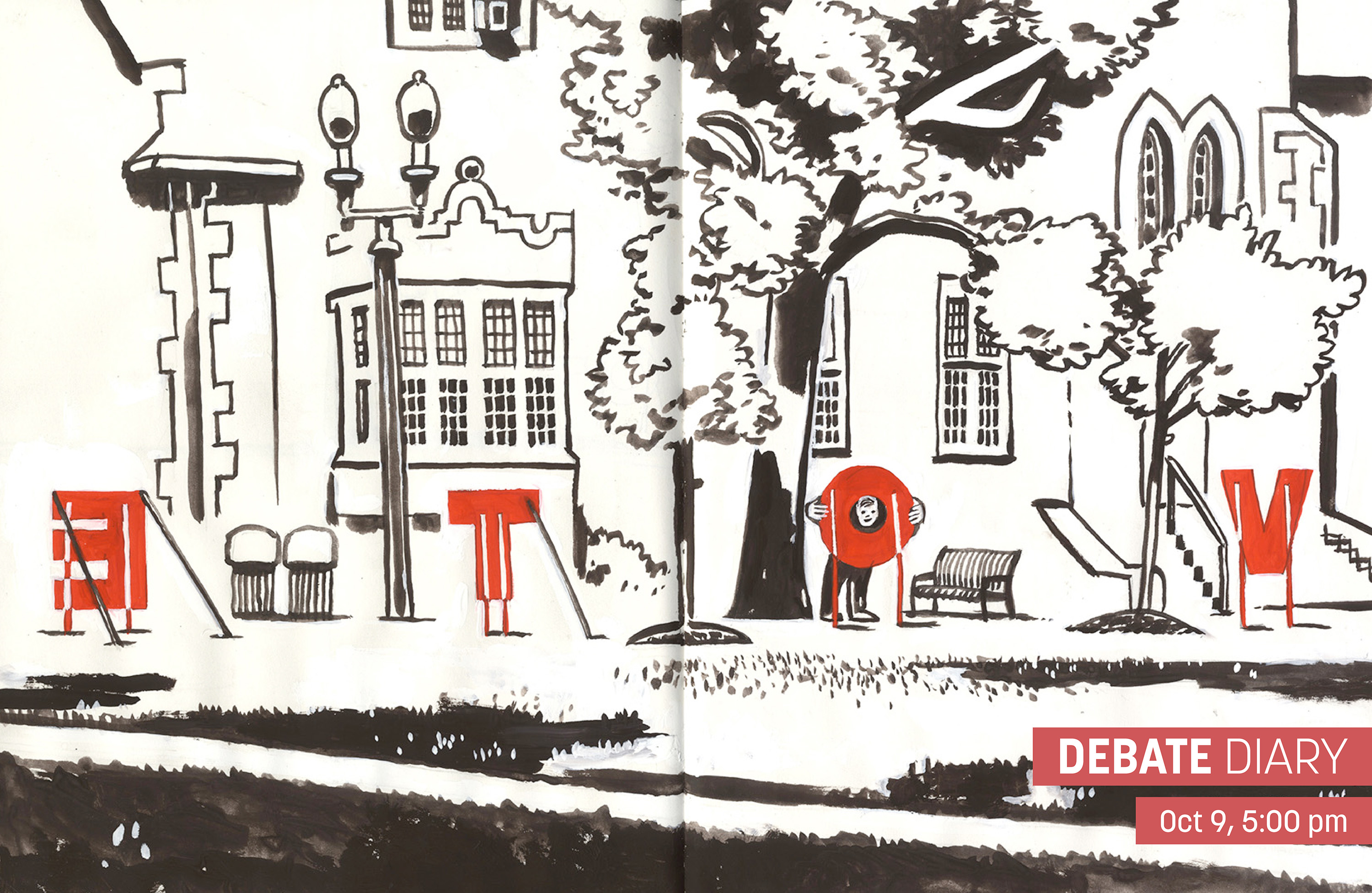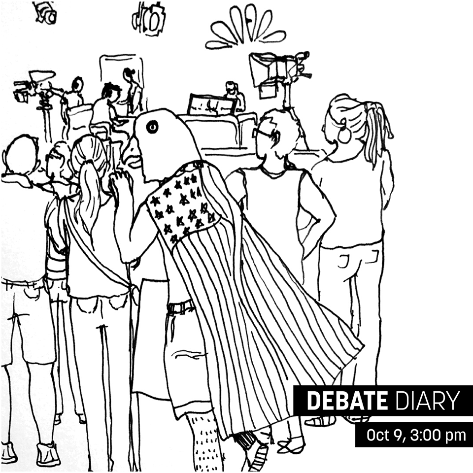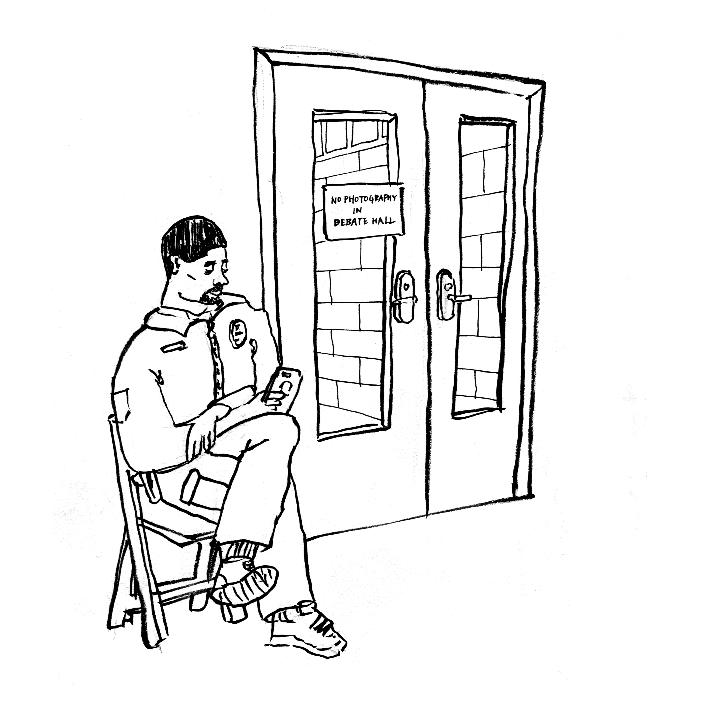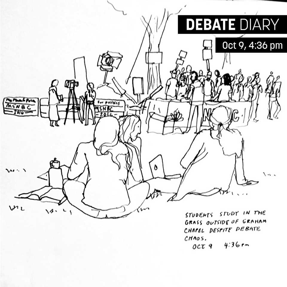 “What we found interesting were the quiet moments that media might overlook,” said Susan Lee, a senior communication design major and one of the group’s primary illustrators. “We tried to record the real people who helped to make the debate happen.”