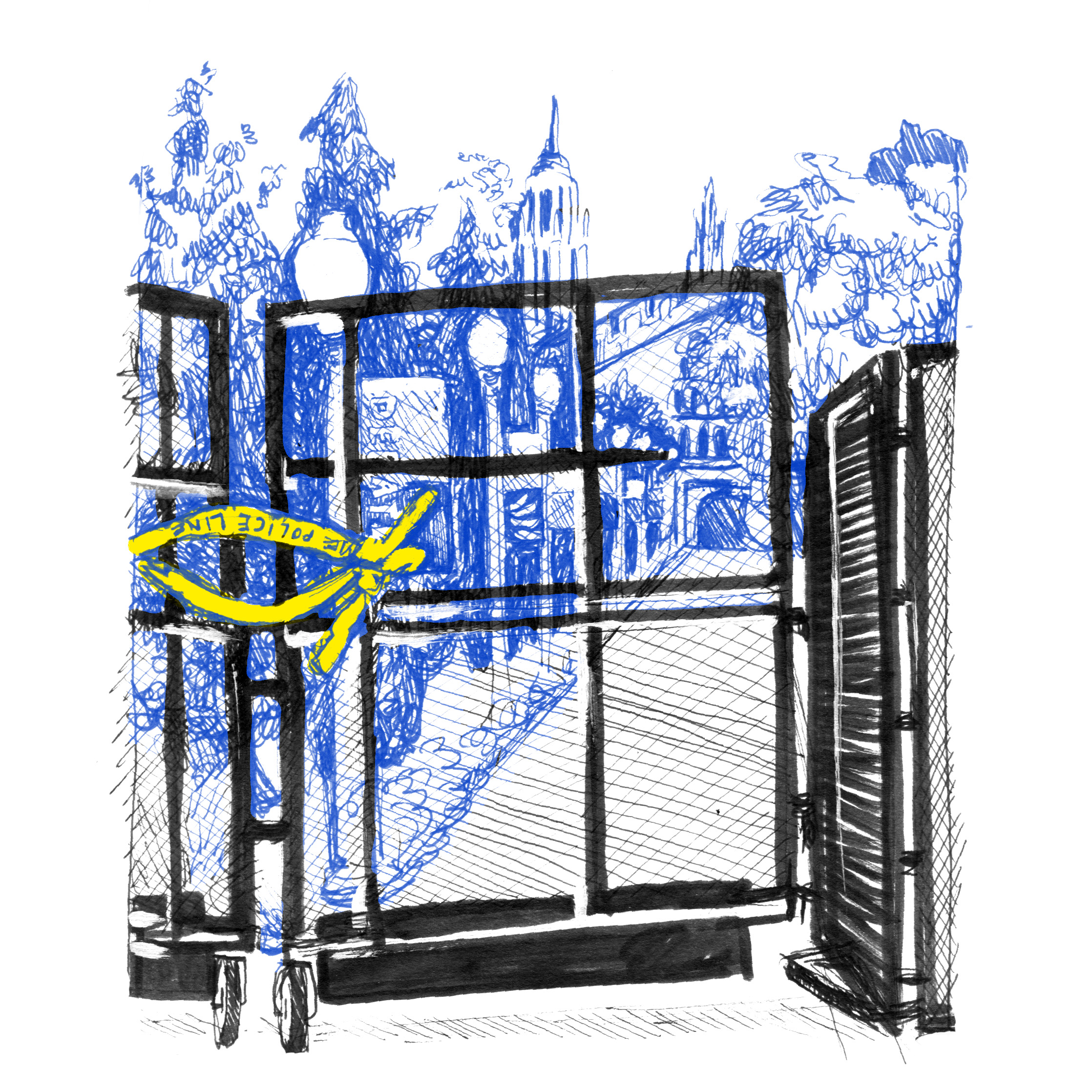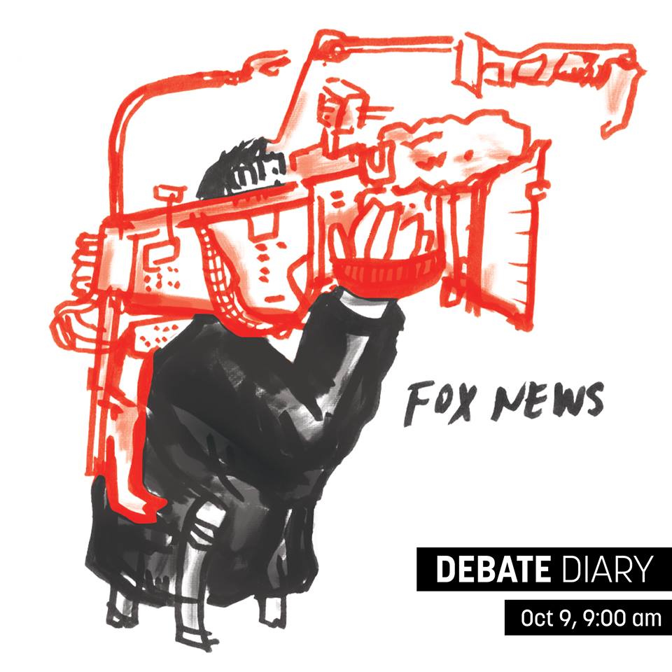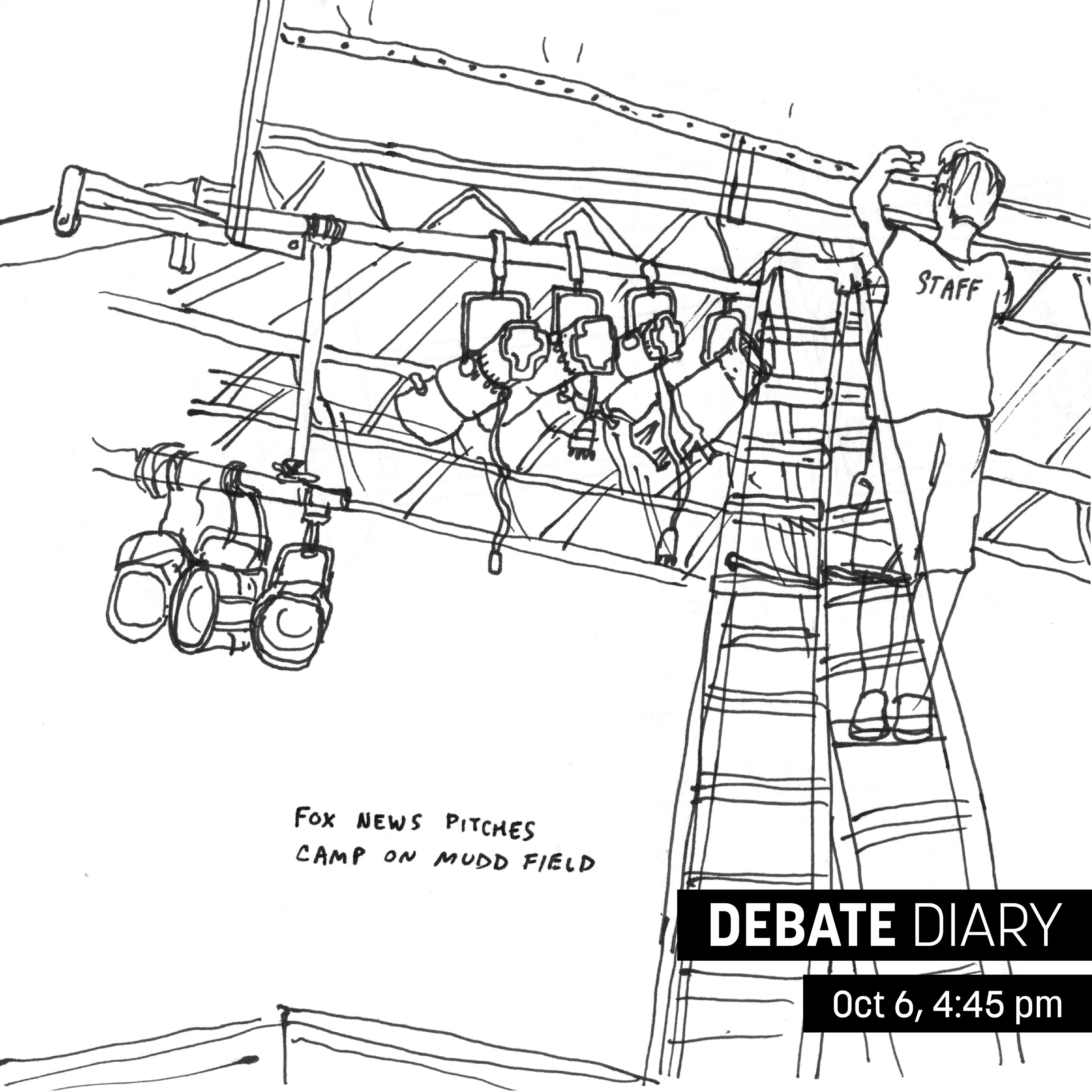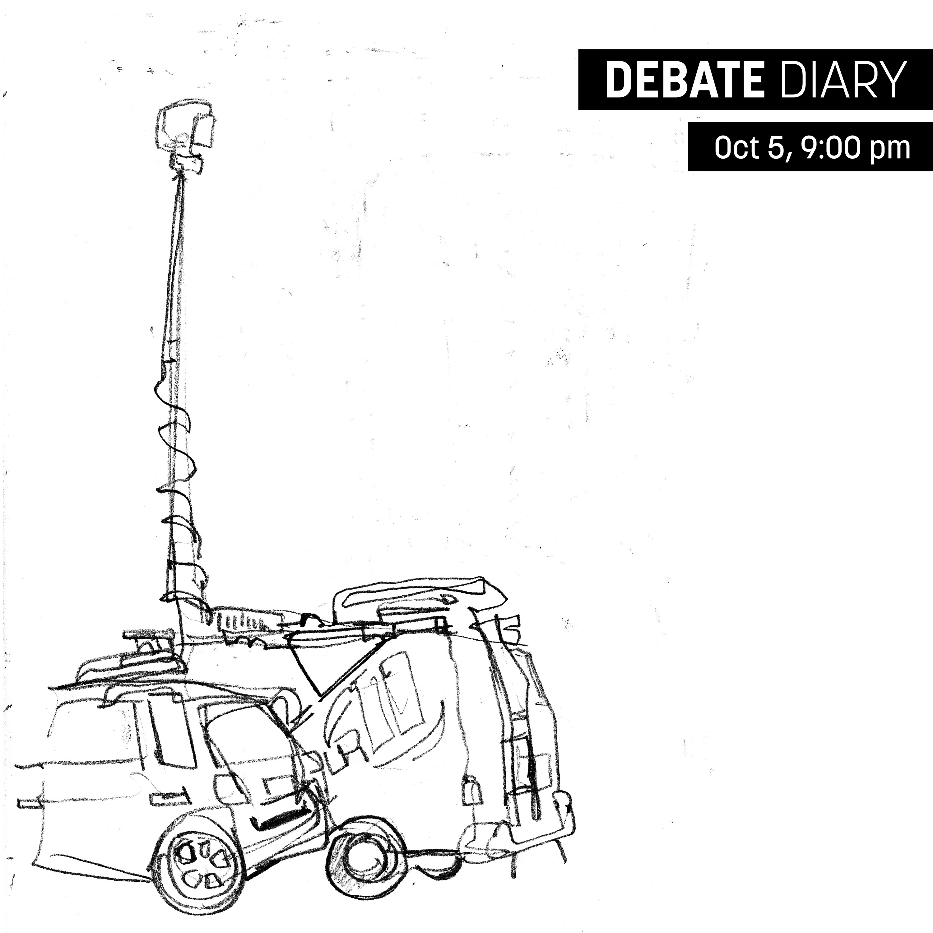 “Campus was like a carnival without rides,” said illustrator Francesca Maida, a senior communication design major who documented crowds gathering at the stages of CNN, MSNBC and Fox News, as well as the Public Expression Zone. “The energy was vibrant. Everyone wanted to voice their opinions. It was loud and fun to be there.”